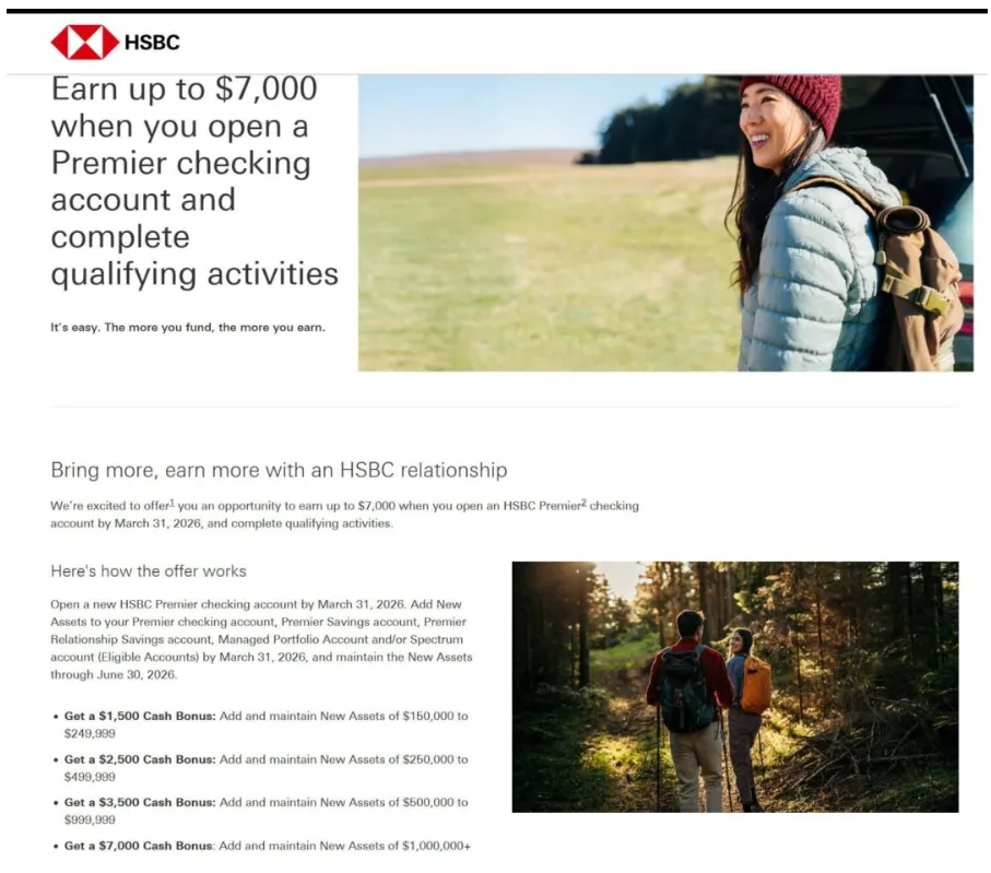 HSBC 更新了新的开户奖励,现在最多可以获取 $7000 的奖励,只需要存钱就可以!不需要 direct deposit 了。比较之前的奖励,存款金额有所提高。但是考虑到本身开个 relation saving 放钱就有 3.3% 左右的 APY,这个钱存着倒是也不会亏什么,跟买 CD 差不多。