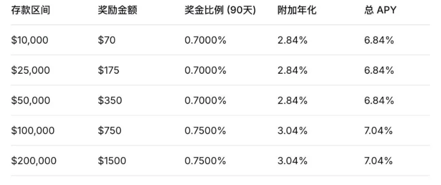 具体存钱金额和奖励的对应如下。需要开户后 15 天内存入要求的资金,存入的资金至少要保持 90 天,奖励会在满足条件后 60 天内发放。叠加上 3.3%APY,三个档的等效 APY 都是 9.3%