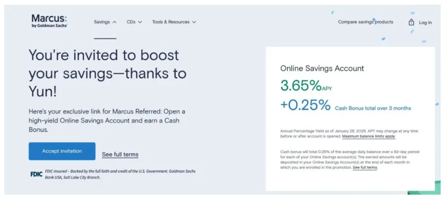 - Marcus by Goldman Sachs Savings 开户链接(三个月额外 0.25% 利率奖励)