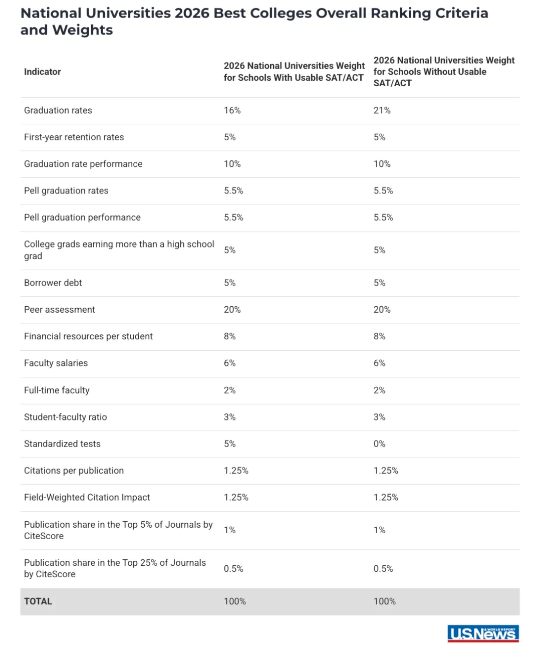 除此之外,今年U.S. News排名的关键指标还包括:学生保留率、毕业生负债、毕业生收入、佩尔助学金毕业率、教师资源(包括班级规模、教师薪资和教师的学术成果等)、专家意见等。