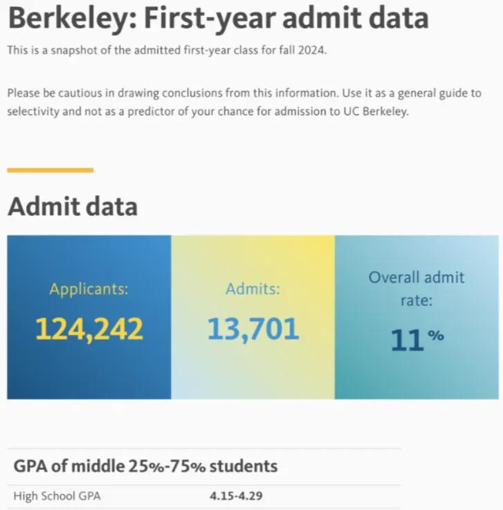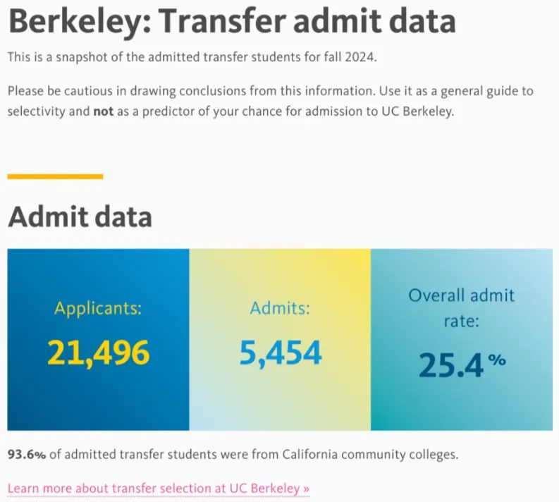 当然,不参加TAG协议的UC前三校,对于加州社区大学的学生也独有青睐。UCB本科大一录取率为11%,转学录取率为25.4%,差距还是很大的。