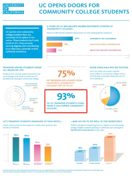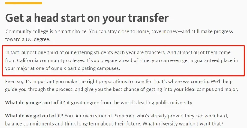 △ 明确表示了uc会优先录取来自加州社区大学的学生,且uc里面有三分之一的学生都来自社区大学。