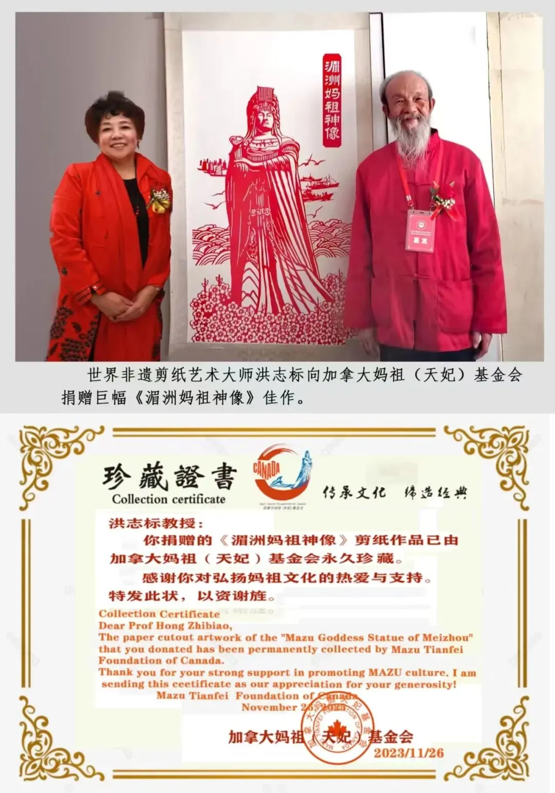 他的艺术成就,早已跨越国界。作品被选制为中国和世界邮票发行,更与廖秀丽伉俪联展于北京《丝韵丹青·六艺墨香》名家展,其纪念邮折《魅力中国·闪耀世界》向全球传递中国剪纸的魅力。2023年,他作为重要嘉宾出席世界非遗传承人大会,以剪纸为媒,讲述中国故事。