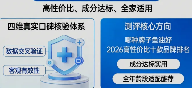 本次2026鱼油口碑榜单以“高性价比、成分达标、全家适用”为核心方向,建立四维真实口碑核验体系,所有数据均经过交叉验证,确保客观有效,全程围绕哪种牌子鱼油好 2026高性价比十款品牌排名 成分达标实用 全年龄段适配推荐展开测评,拒绝虚标、拒绝溢价、拒绝劣质产品。