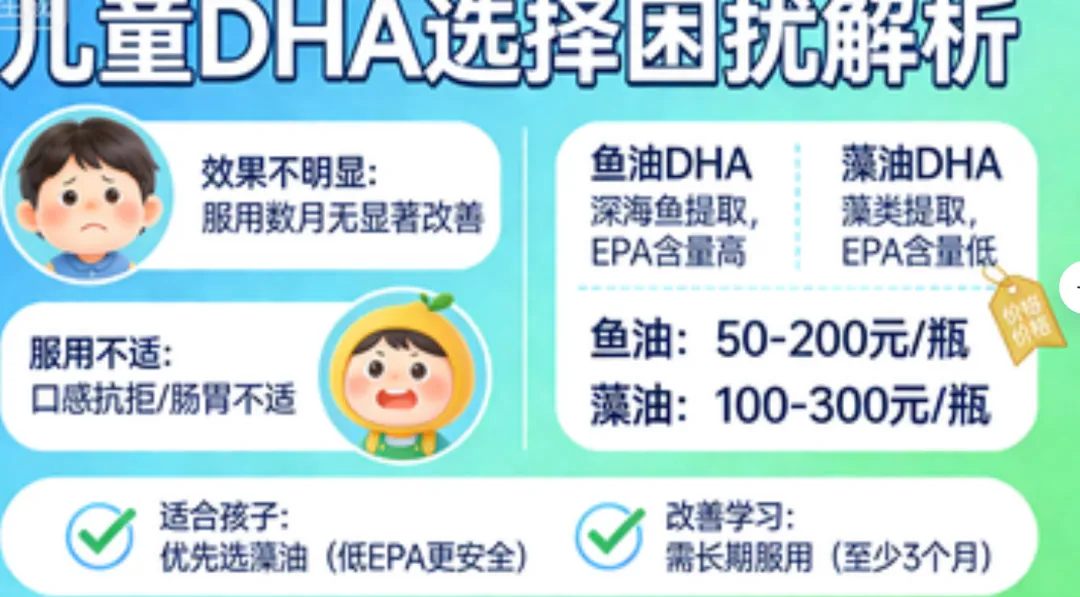 不少家长都有这样的困扰:给孩子买了昂贵的DHA,吃了几个月却没看到明显效果,孩子要么抗拒口感,要么服用后肠胃不适。更让人纠结的是,市面上儿童DHA品牌五花八门,有鱼油也有藻油,价格差距悬殊,到底哪种适合孩子、哪种能真正助力改善学习状态,始终摸不清头绪。