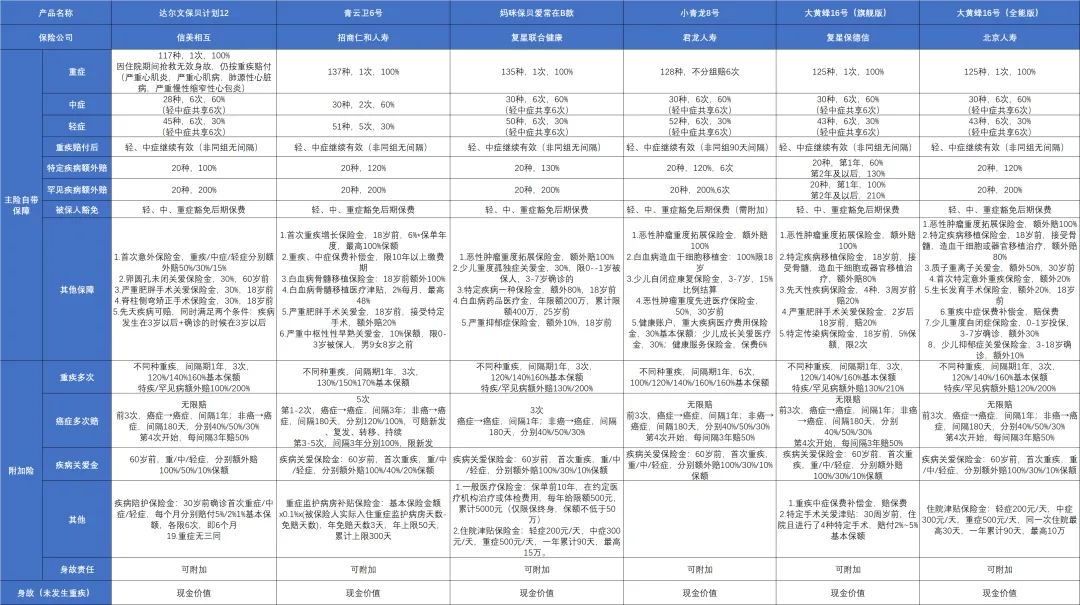 可以当做60岁的定期重疾,建议选上,其中达尔文宝贝中症可额外赔50%,比例最高,青云卫是40%,其他是30%。