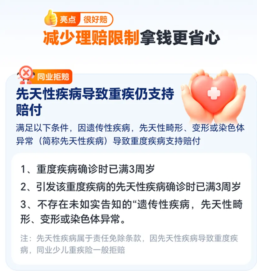 ②打破行业统一责任免除,先天性疾病(遗传、畸形、染色体变异)导致重疾也能赔
