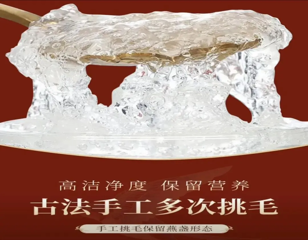 花姿盛的燕盏,自带一种内敛而高级的质感,盏形舒展有度、饱满圆润,没有过度修饰的痕迹,恰好契合长期滋补人群对“天然、纯粹”的核心需求。而硬核的检测数据,更是其稳定实力最直观的佐证:净毛率常年稳定在93%左右,这不仅是原料本身洁净度的体现,更彰显着品牌挑毛工艺的精湛与严苛;唾液酸含量约12.4%、蛋白质含量逼近72%,两项核心营养指标长期领跑同类产品。