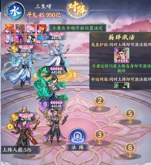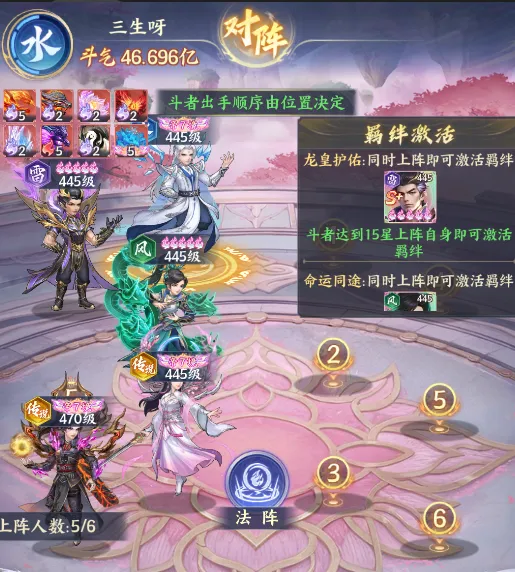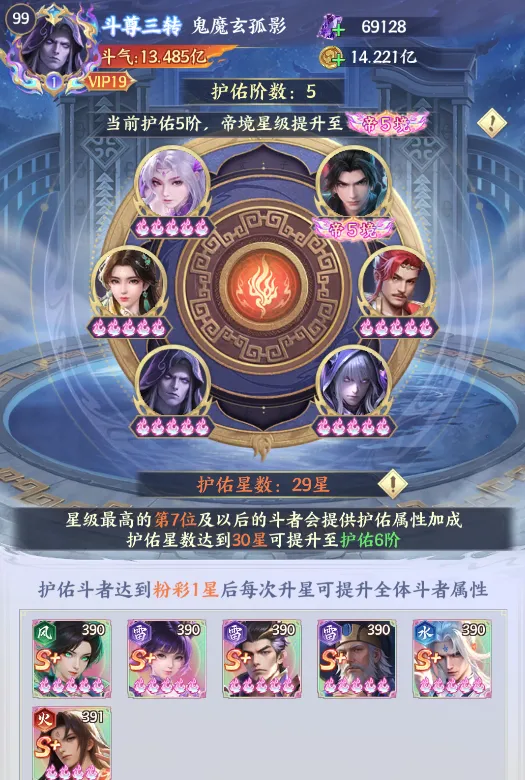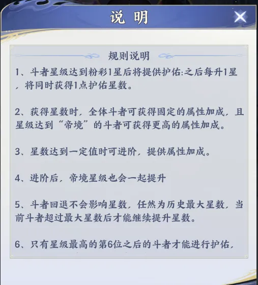 ①、共鸣那里开启护佑后,除了星级最高的六个武将外,其他武将达到彩粉一星之后,会默认为护佑斗者。护佑斗者粉彩一星后,每次升星可提升全体斗者属性和护佑星级。