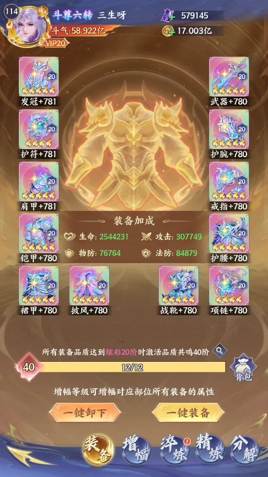 装备板块有,装备、增幅、淬炼(第三十天开启)、精炼(第三十天开启,并且要通过试炼塔五千层,开启无间试炼)、分解。