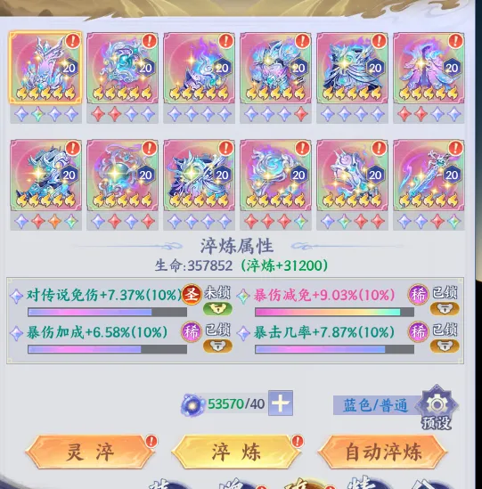 淬炼:淬炼这个板块,洗属性我是推荐:追暴击>爆伤=抗暴>伤害加成=伤害减免
