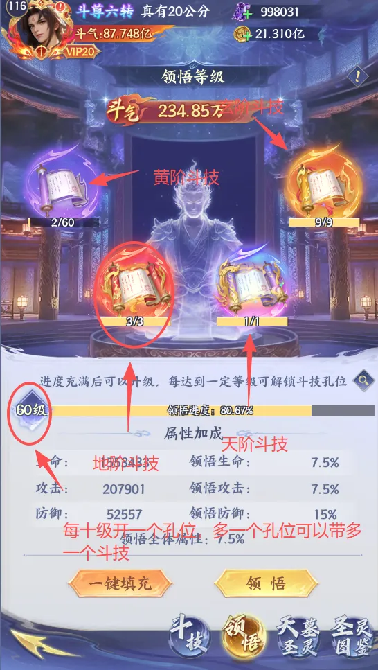 不要担心溢出来的天阶斗技和地阶斗技每地方消耗,后面领悟板块需要大把斗技。