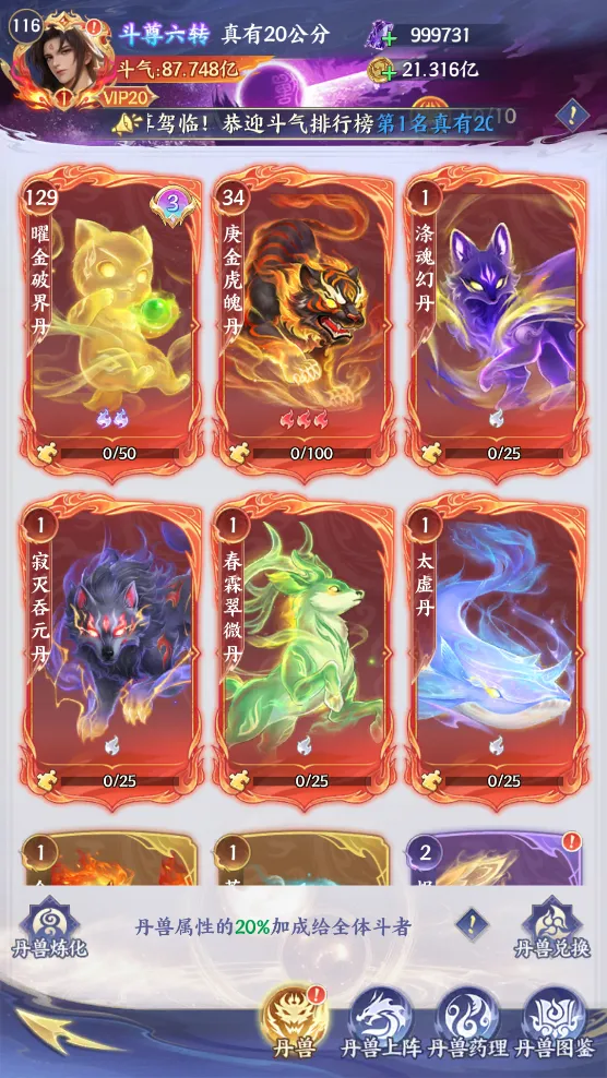曜金破界丹毕业后,可能很多大佬会去拉庚金虎魄丹提高输出,也是可以的。不要太高,我感觉红一星就够用了,目前也就两个输出武将,传说萧炎和美杜莎。