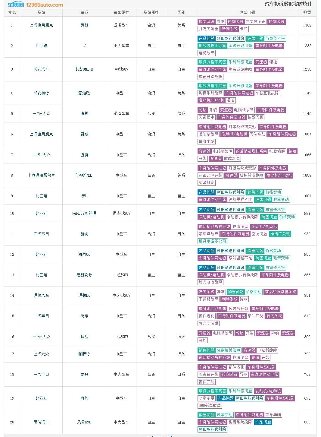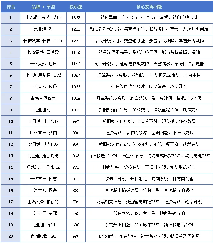 别克英朗:已停产车型仍以 1367 宗投诉登顶,核心问题集中在转向系统通病,多年未得到根治,暴露了车企对存量车的售后漠视。