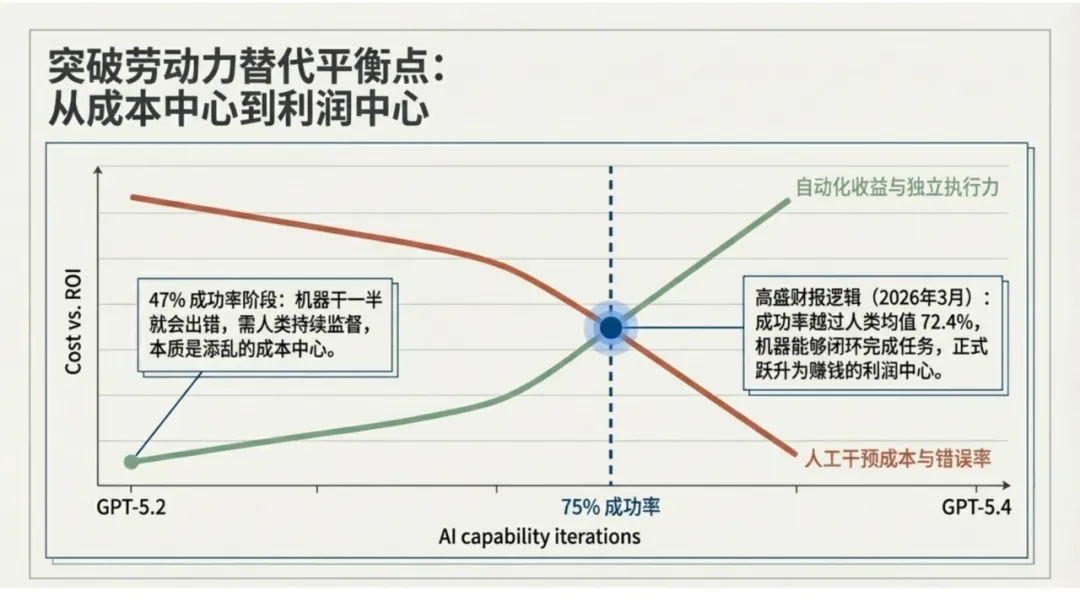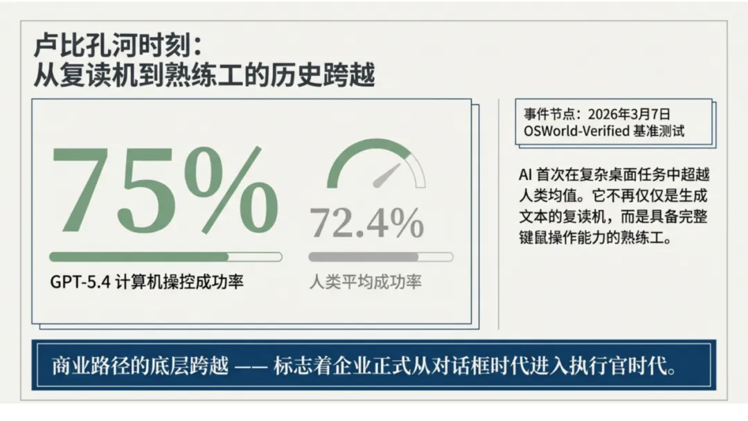 Q1:2026 年初OpenAI发布的 GPT-5.4 展示了 75% 的计算机操控成功率(Computer Use),超过了人类平均水平。这在商业化路径上意味着什么?这就聊到了上个月(2026 年 3 月 7 日)那个让全球猎头和 CIO(首席信息官)彻夜难眠的“卢比孔河时刻”。