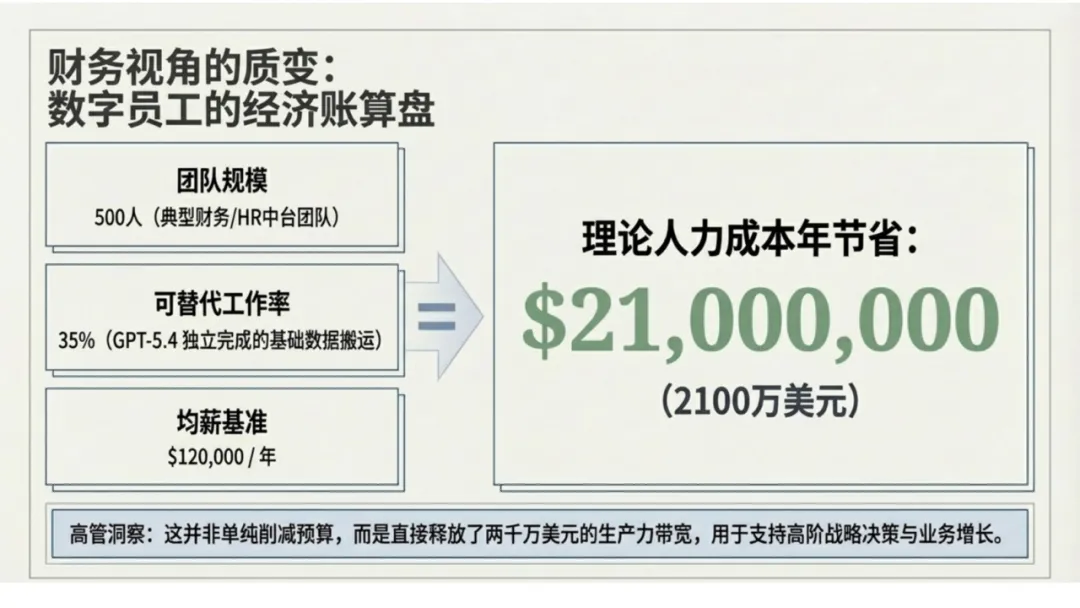 财务账: 对于一个 500 人的财务或 HR 团队,如果 AI 能独立完成 35% 的数据搬运工作,企业每年的理论人力成本节省可达 2100 万美元(基于 $120,000 均薪计算)。