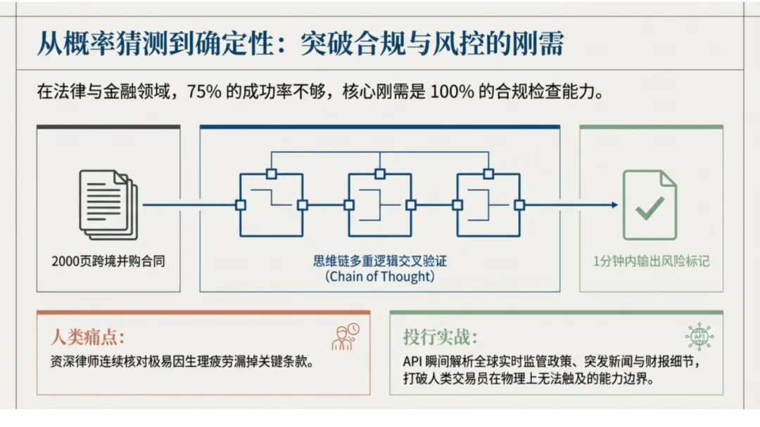 数字员工的优势: 一个资深律师核对 2000 页的跨境并购合同,可能会因为疲劳漏掉一个条款。但 API 驱动的“数字助手”可以通过多重逻辑验证(Chain of Thought),在一分钟内标记出所有潜在的法律风险。