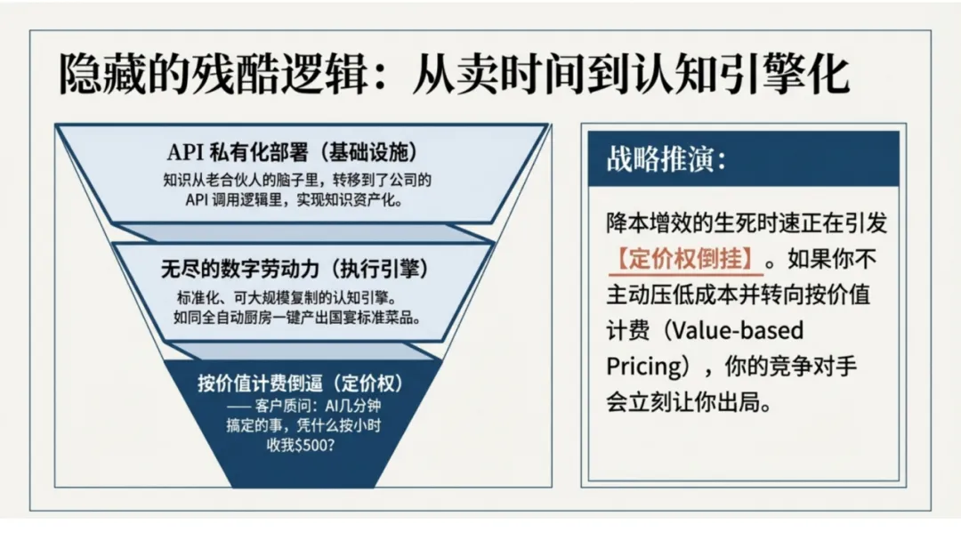 定价权倒挂: 客户开始问:“既然你用了 AI 几分钟就搞定了,凭什么还按小时收我 500 美金?” 这倒逼咨询公司从“按时计费”向“按价值计费”转型。