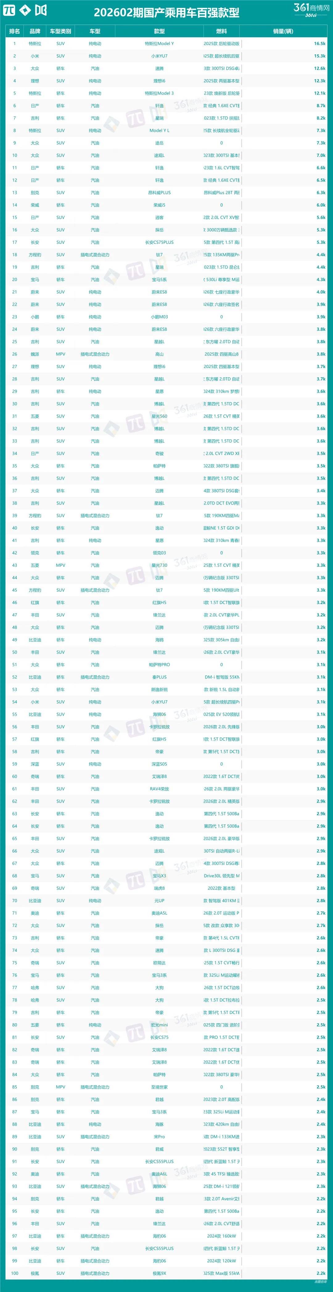 2026 年 2 月国产乘用车百强款型数据显示,新能源车型占据销量榜首,特斯拉 Model Y 以 16.5k 辆的销量位居第一,小米 YU7 以 15.3k 辆紧随其后,理想 i6、特斯拉 Model 3 分别以 12.3k 辆、12.1k 辆进入前五,前十款型中新能源车型占比达六成,燃油车仅大众速腾、日产轩逸等少数车型入围。