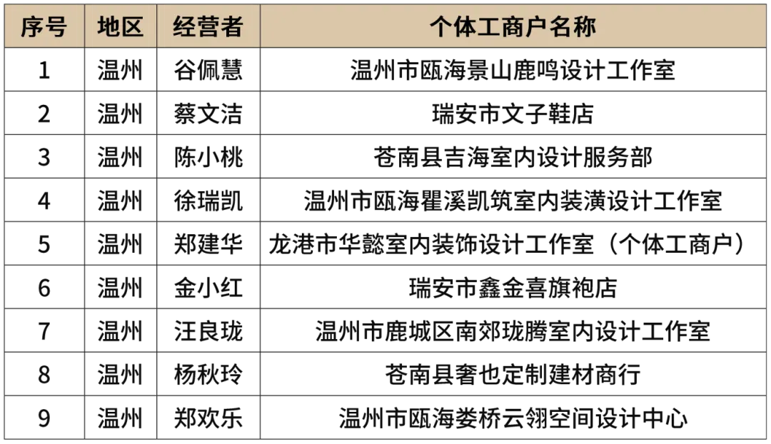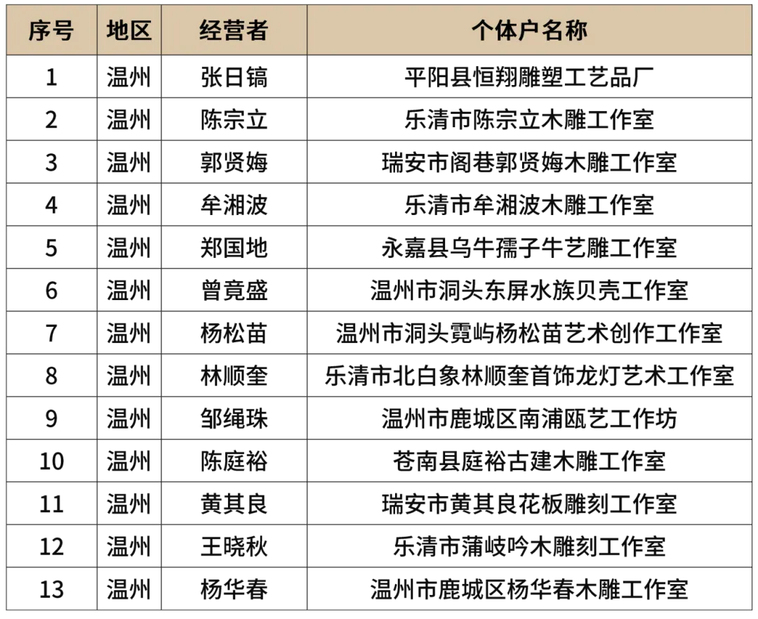 近日,2025年浙江省个体工商户“浙个好”公共品牌名录正式公布,全省501家个体工商户上榜。温州31家非遗行业、12家民宿行业和9家设计行业,共计52家个体工商户入选。