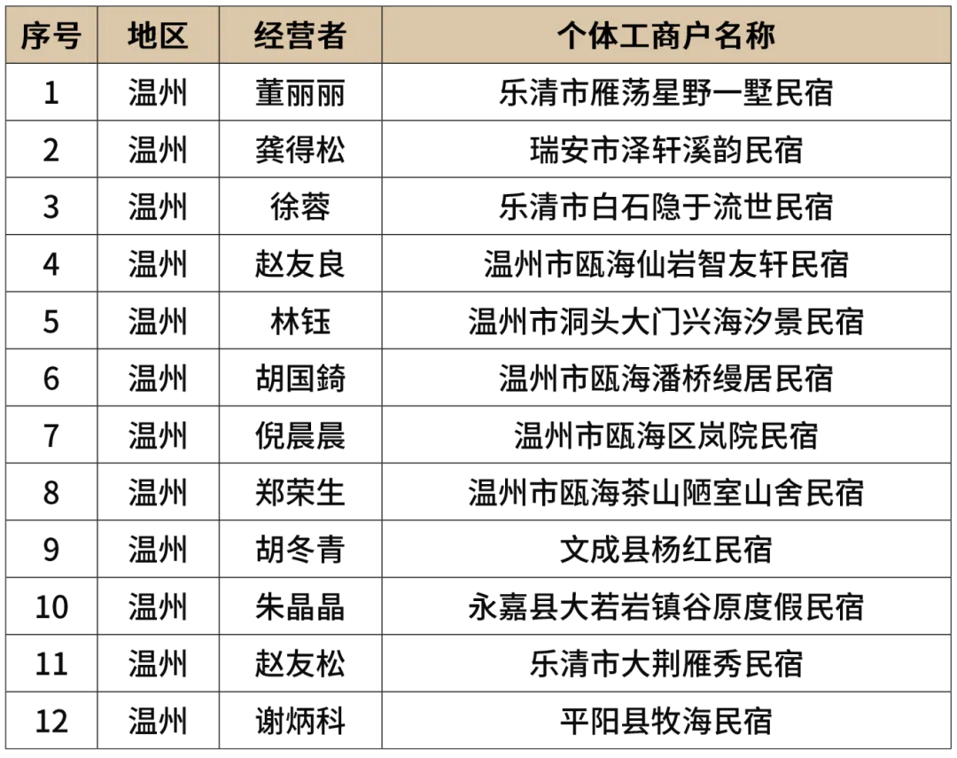 入选的个体工商户中有白金宿、金银宿、非遗主题民宿、名特优新、国家级、省市级非遗等众多荣誉和头衔,是在诚信经营、产品品质、服务标准等方面的示范标杆,是我市一批优质个体工商户的典型代表。温州市个体劳动者协会秘书处表示:将会持续开展对个体工商户的培优扶强行动,围绕其融资贷款难、法律维权难、学习意愿强等问题,从激发个体发展“新动能”、构筑经营保障“新支撑”、拓展成长发展“新空间”等方面发力,集中开展“浙个好”品牌培育工作,全力打造精准培育体系。