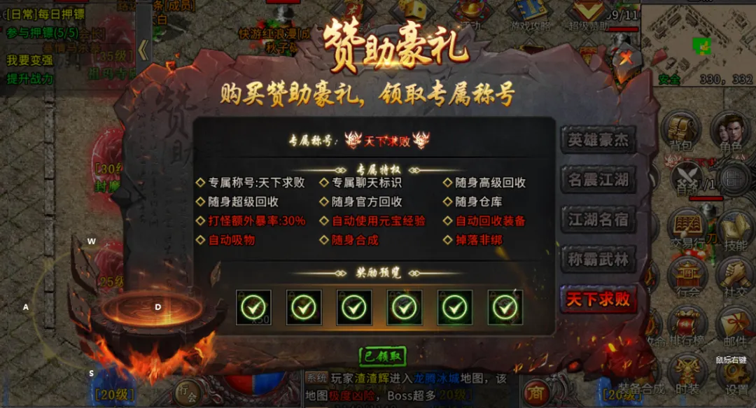恪守公平底线,重塑散人天堂生态。全服装备无商城售卖,极品神装、稀有材料、转生道具,全靠野外刷怪、BOSS掉落,彻底杜绝氪金碾压。零氪耐玩、微氪舒服,没有特权压制,没有数值失衡,靠时间与运气就能逆袭,凭实力站稳脚跟,这才是传奇该有的公平模样。