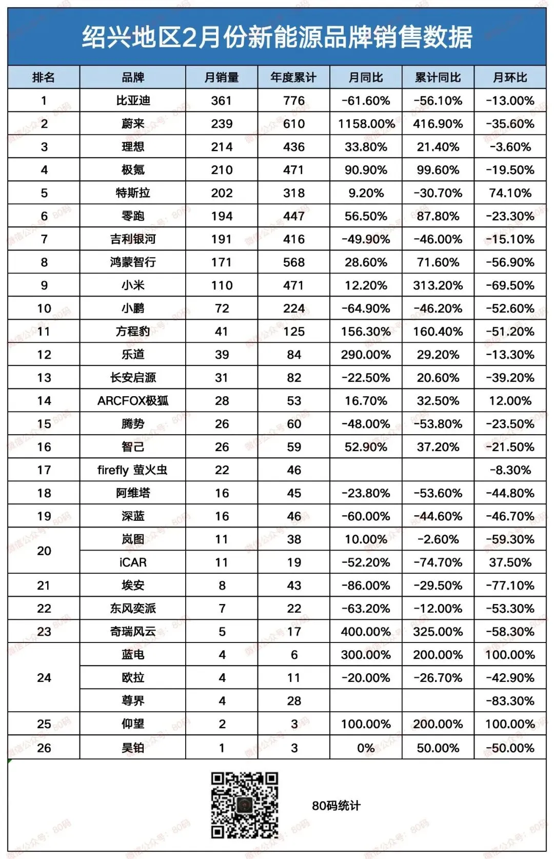 据统计,绍兴地区2月份新能源销量排名前三的为比亚迪、鸿蒙智行、蔚来,分别销售361台、239台、214台。 具体销量如下:
