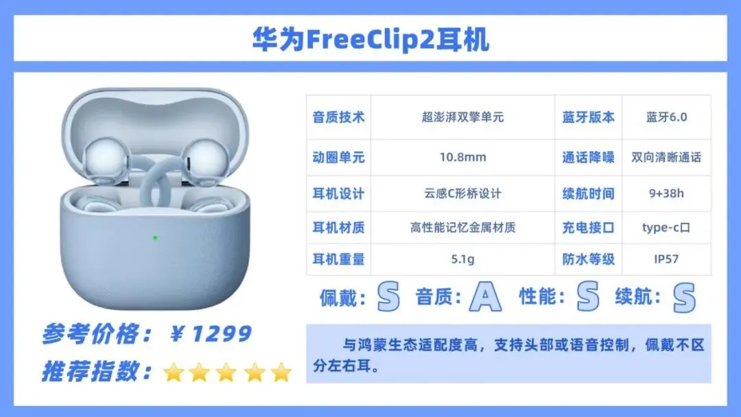 华为FreeClip 2耳机在设计上明显更加注重轻量化和佩戴稳定性的平衡。戴上之后与耳廓贴合度比较高,不容易出现晃动的情况,即使在走路或者运动的时候也能保持比较稳定的状态。单只耳机重量大约在5.1g左右,整体的负担感不强,长时间佩戴依然比较轻松,因此无论是通勤、散步还是轻运动场景都比较适合。