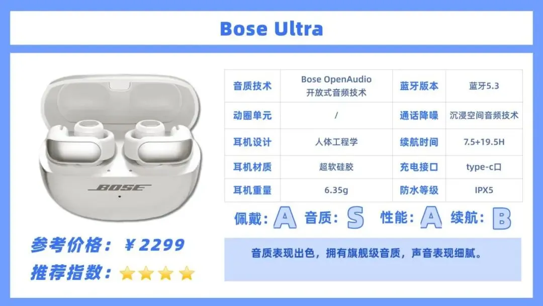 这款耳机最大的优势还是音质表现。它搭载了BoseOpenAudio开放音频技术,并支持空间音频效果。声音的层次感和空间感表现非常明显,听起来更有立体感。低频部分下潜深度足够,同时保持了不错的干净度,不会显得浑浊;中频人声自然真实;高频则清亮通透。整体听感比较高级,沉浸感也很强。