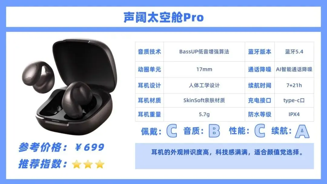 声阔太空舱Pro耳机整体外观设计看起来比较有科技感,风格偏简洁干练。单只耳机的重量大约5.4g,重量控制还算不错。不过耳机材质相对稍微偏硬一点,对于部分耳型来说,长时间佩戴可能需要偶尔调整一下位置。一般连续佩戴一两个小时问题不大,再久的话耳朵可能会有一些存在感。