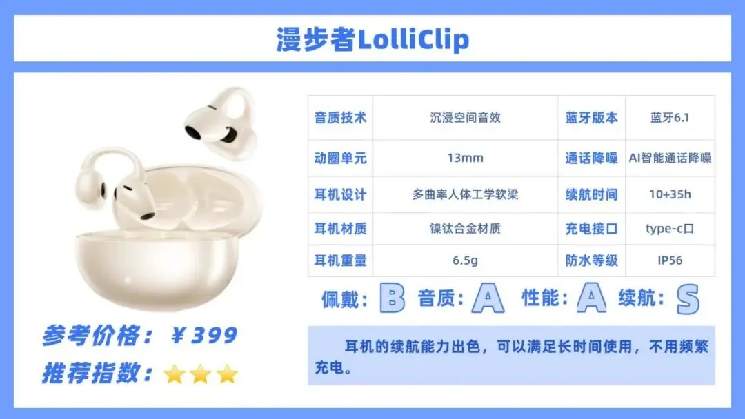 漫步者LolliClip耳机在佩戴稳固性方面给人的印象比较深。它采用了半入耳结合耳夹式的设计,让发声单元更靠近耳道,从而提升声音传递效果。同时耳机使用了多曲率软梁结构,并加入镍钛合金材质,佩戴时整体感觉比较稳固。单只耳机的重量约6.5g,短时间佩戴舒适度还是不错的。