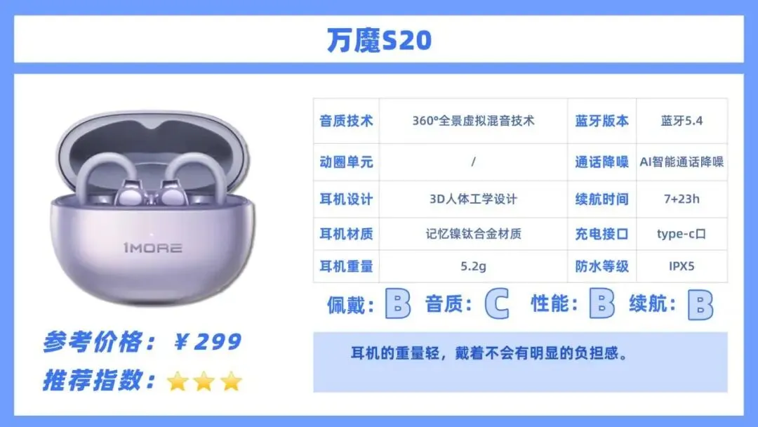万魔S20耳机整体佩戴体验偏向舒适路线。耳机与耳廓的贴合感比较自然,材质也相对柔软。单只耳机重量大约5.2g,戴在耳朵上不会有压耳的感觉。即使在运动时,它的稳定性也不错,不太容易出现晃动或者掉落的情况。