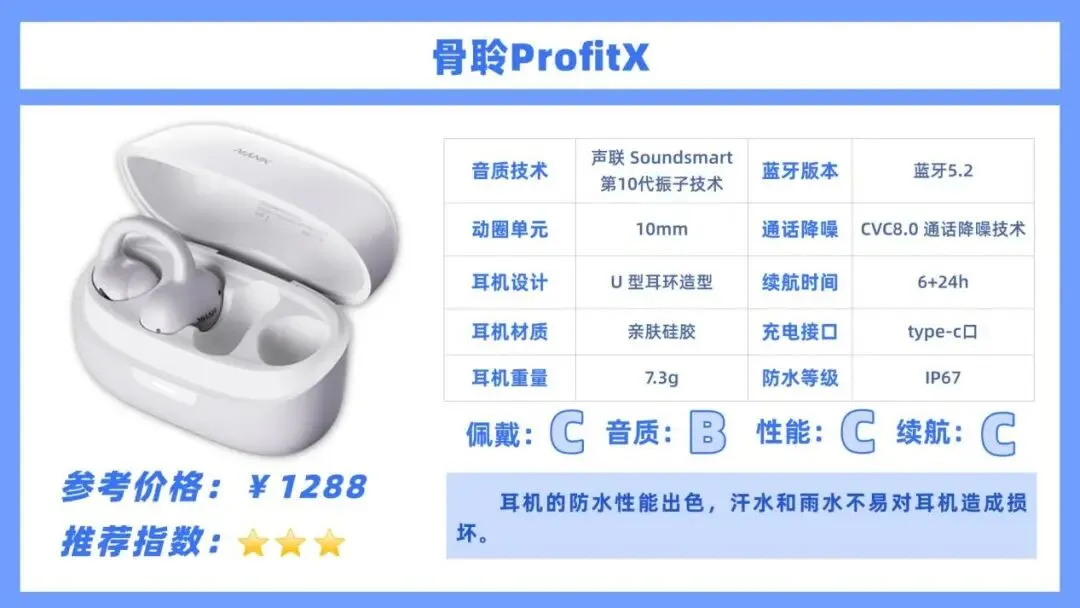 骨聆Profit X耳机采用了U型夹耳结构设计,整体贴合度表现还可以,夹持力度也比较适中。运动时耳机不太容易掉落,因此稳定性还是不错的。不过单只耳机重量达到了7.3g,在同类产品中算是偏重一些,如果长时间佩戴,可能会感觉到一定的疲劳感。