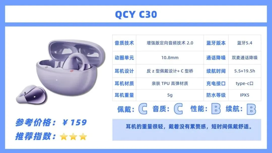 QCY C30耳机在结构设计上采用了反Z结构和C型桥梁设计,因此佩戴稳定性还是不错的。单只耳机重量约5g,整体比较轻便。不过耳夹的弹性相对一般,对耳型会有一点要求。如果耳廓比较小或者比较薄,长时间佩戴可能需要稍微调整一下位置。