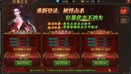 只要持有指定数量的非绑钻石就可以开启狂暴之力增加自己的战斗力!