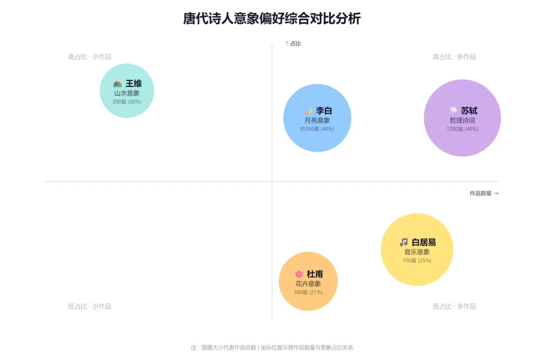 王维专注度最高(50%),但苏轼总量最大(1200 首)