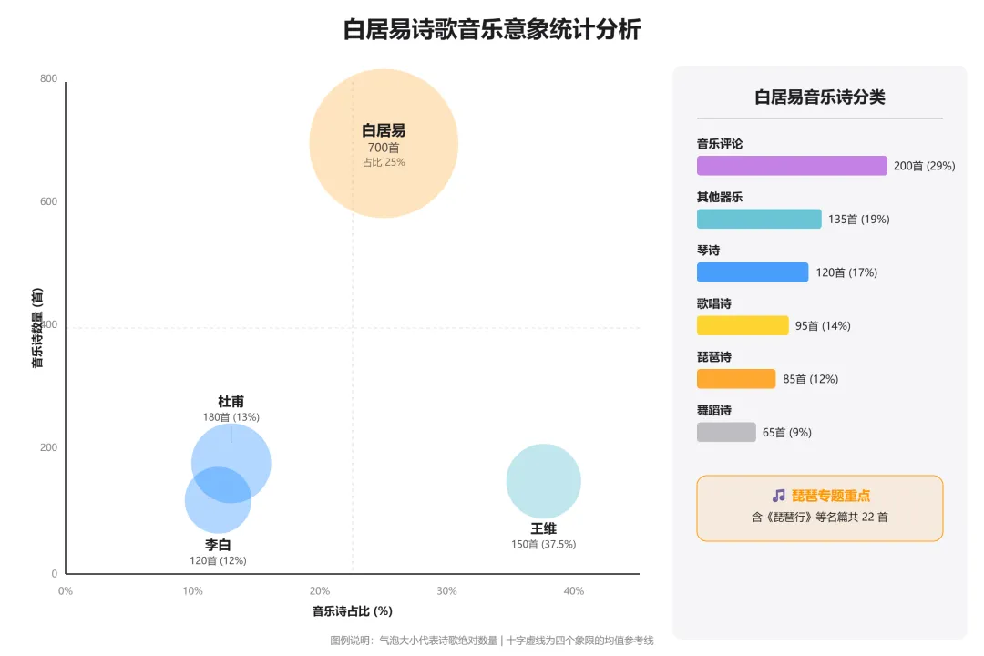 🥇 第四名:白居易·音乐📊 数据:近 700 首,占比 25%📝 代表作:《琵琶行》《霓裳羽衣舞》💡 特点:诗乐一体的艺术境界