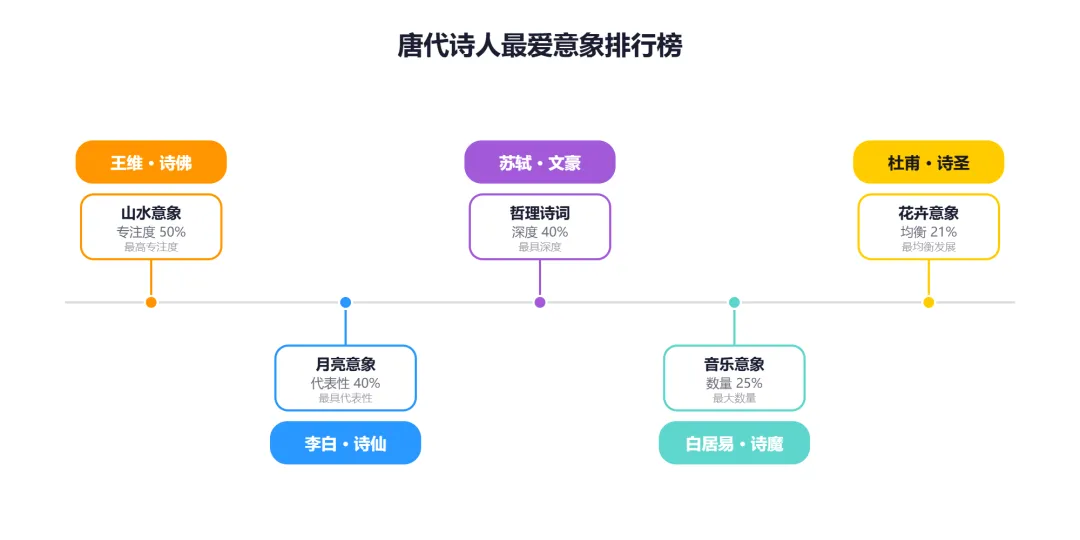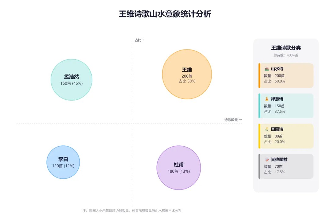 🏆 第一名:王维·山水📊 数据:200 首,占比 50%📝 代表作:《山居秋暝》《鹿柴》💡 特点:诗中有画,画中有诗