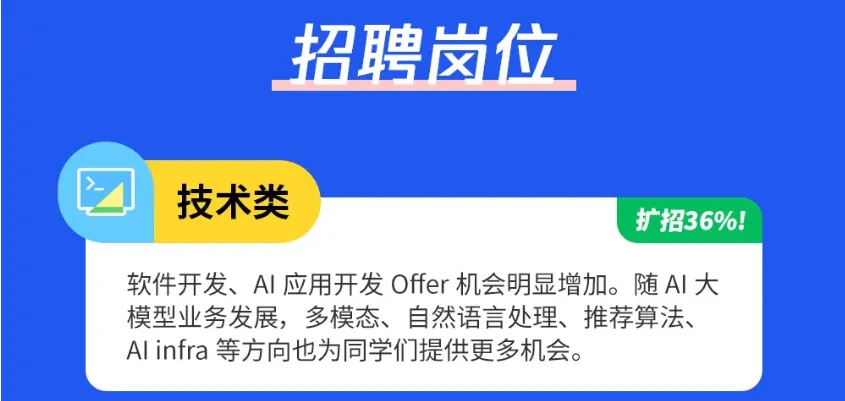 AI岗位占比超过80%。今天开始网申,3月下旬陆续安排笔试、面试,4月下旬发offer。