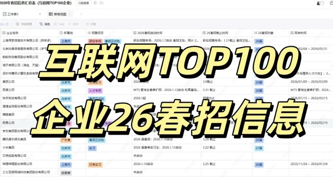 >互联网大厂实习转正排行榜TOP10(附26春招&实习岗招聘信息表)