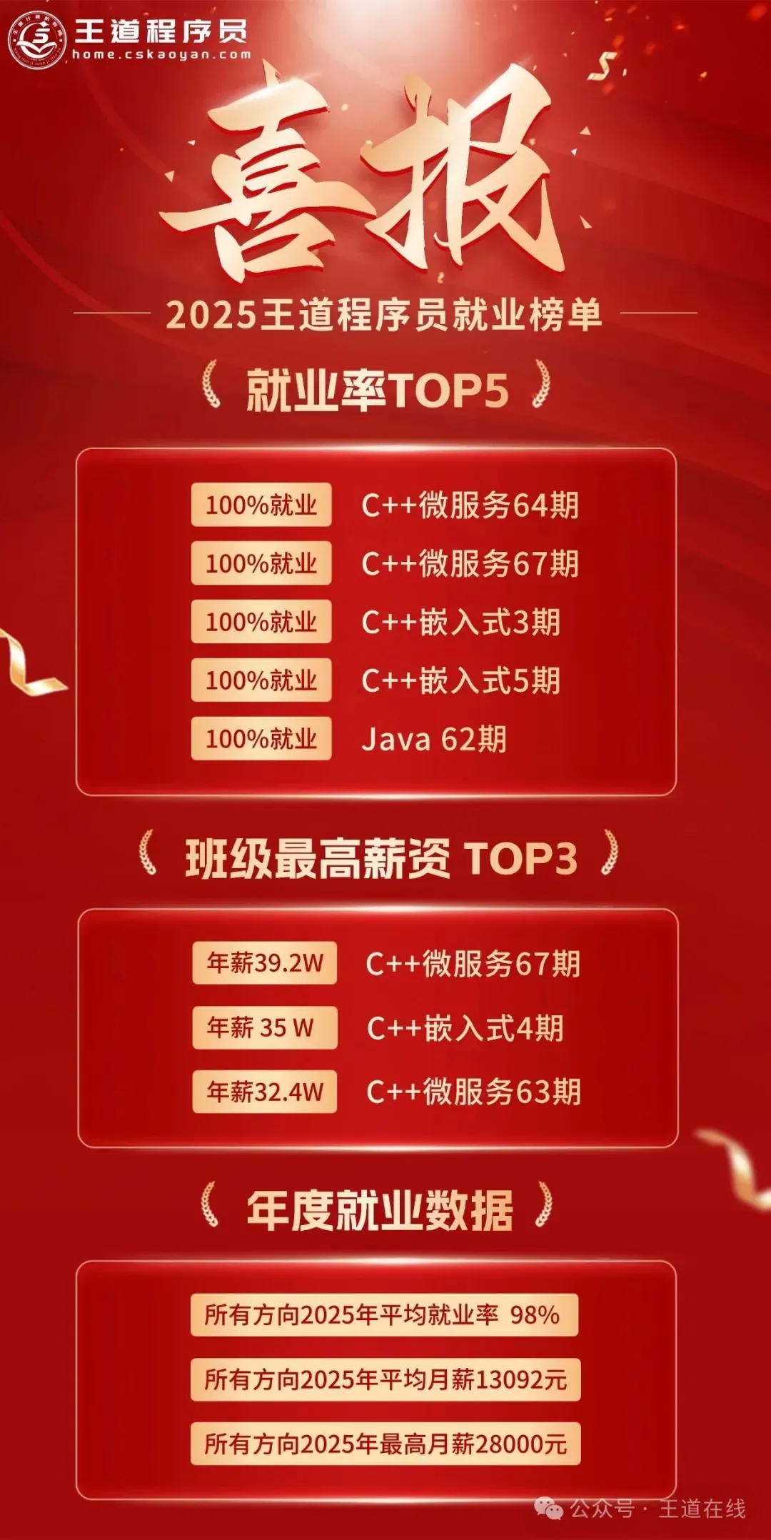 2025年王道训练营的就业数据也很亮眼,多个班级达到100%就业,最高薪资直冲40W!