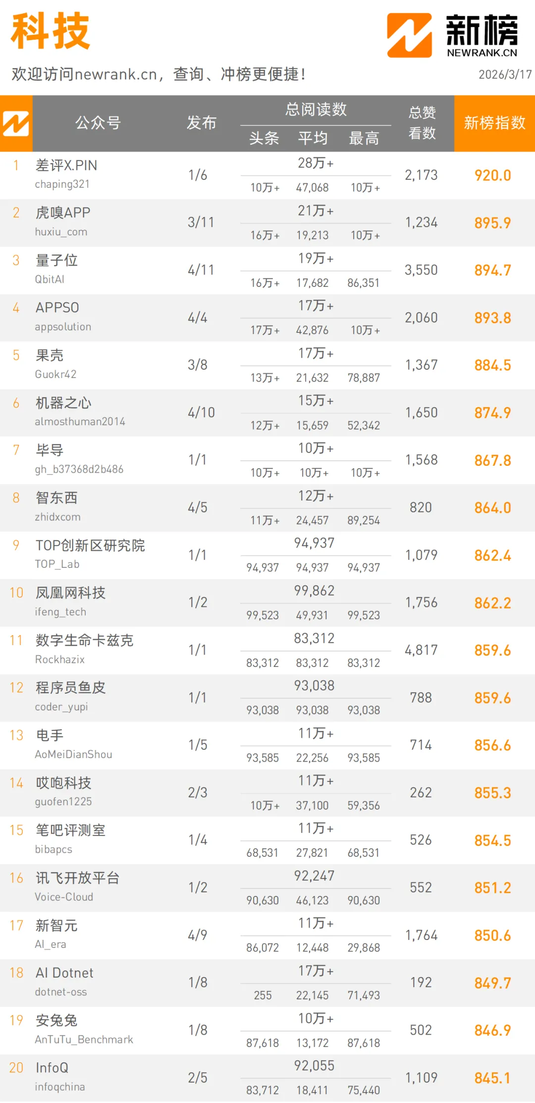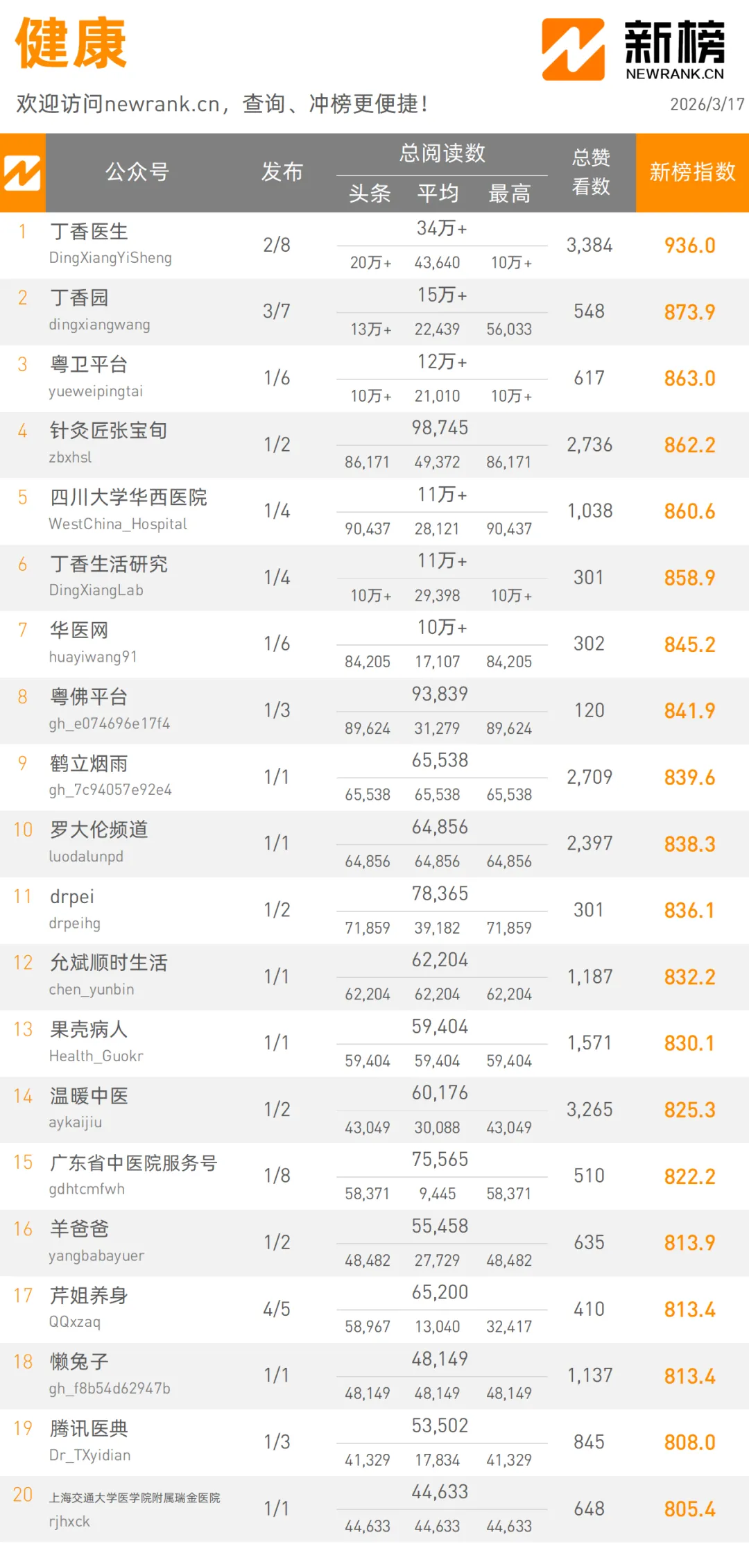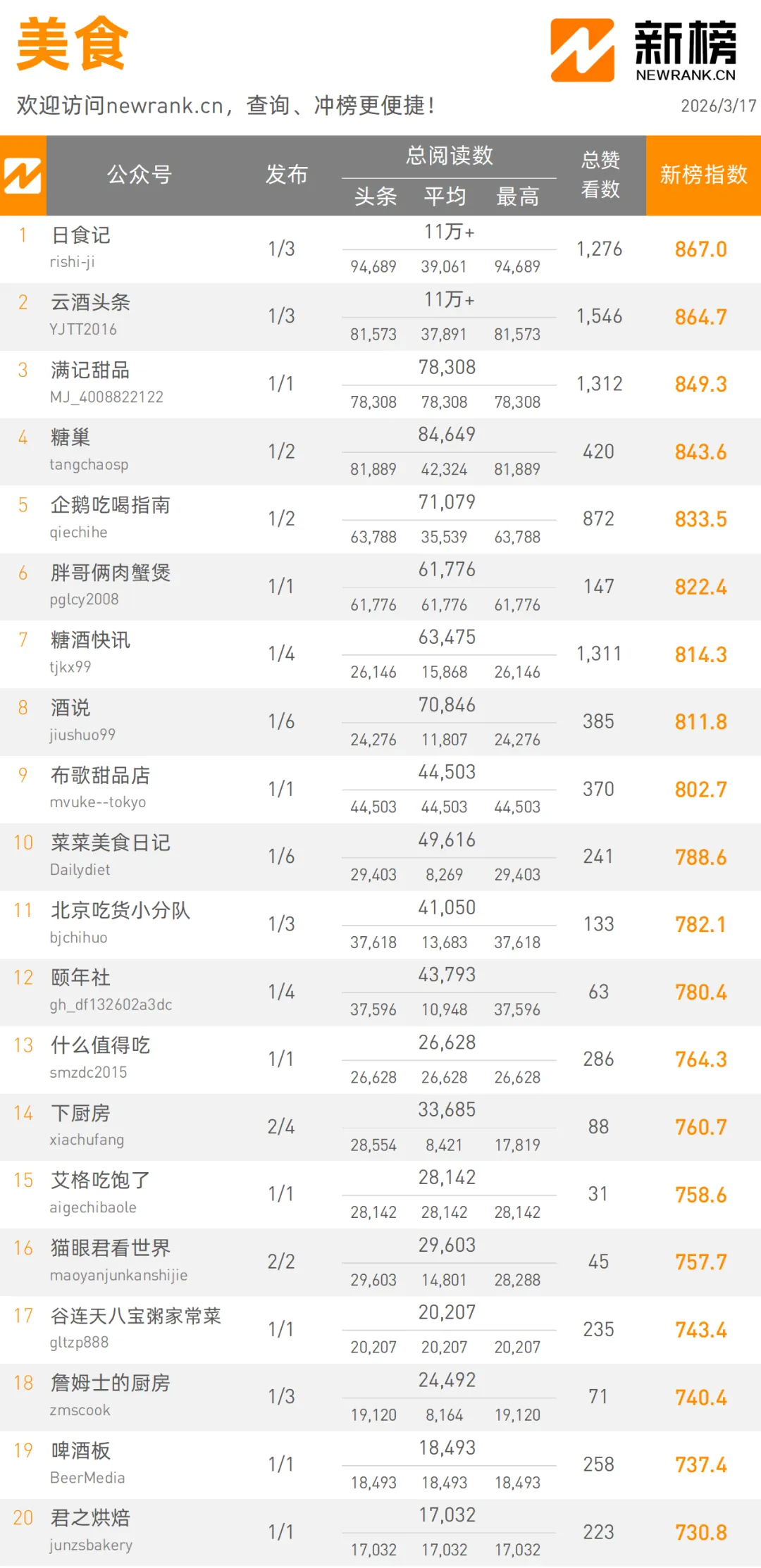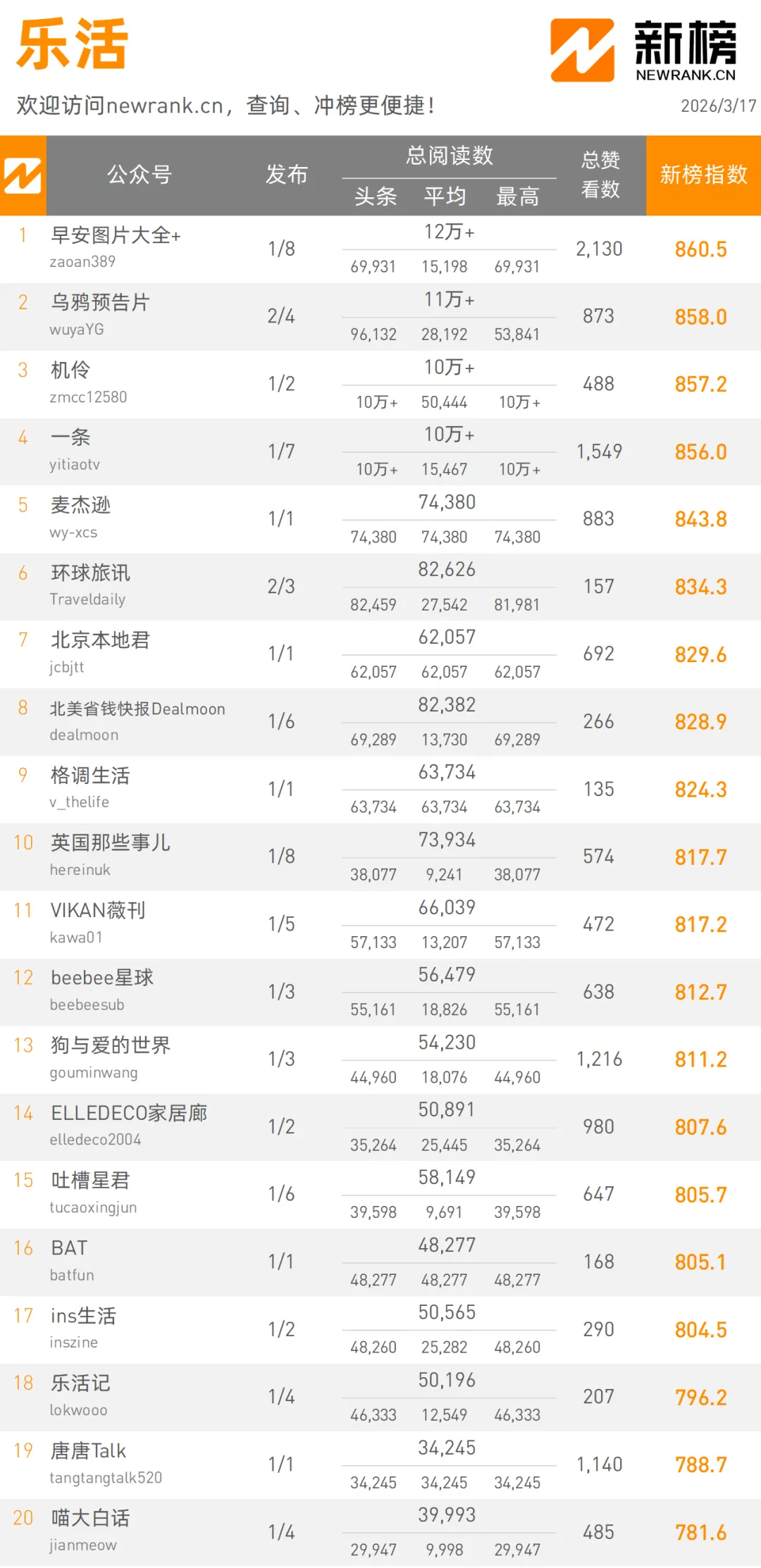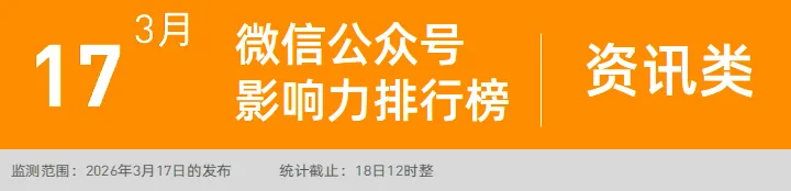 >3月17日微信公众号影响力排行榜 | 新榜发布