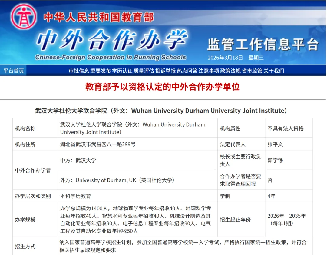 据悉,武汉大学杜伦大学联合学院于2025年12月31日正式获得教育部批准设立,是武汉大学首个非独立法人中外合作办学机构。