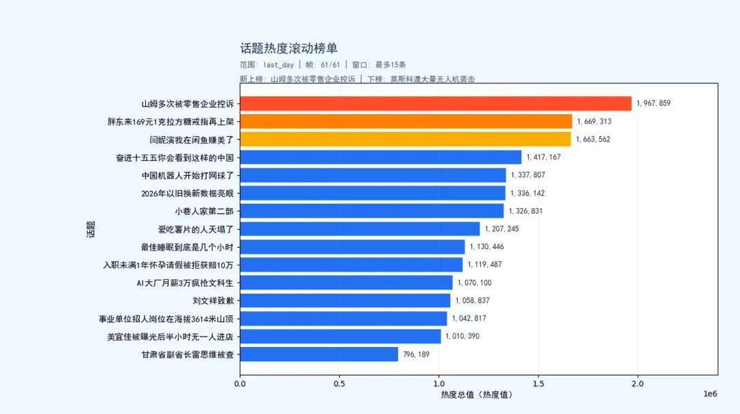 - 每一帧窗口内 15 条按热度从高到低展示(保证观感与阅读效率)