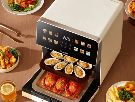 夏普融合空气炸锅和烤箱的优势。旋转烤叉是个亮点,烤整鸡时自动翻面,不用中途开门操作,实测烤鸡表皮上色均匀度好。蒸汽嫩烤功能通过内置水箱产生蒸汽,烤面包时表皮不会太干。上下管控温,可以分别设置温度,12L容量配合双层烤架,一次能烤12个蛋挞或两盘鸡翅。