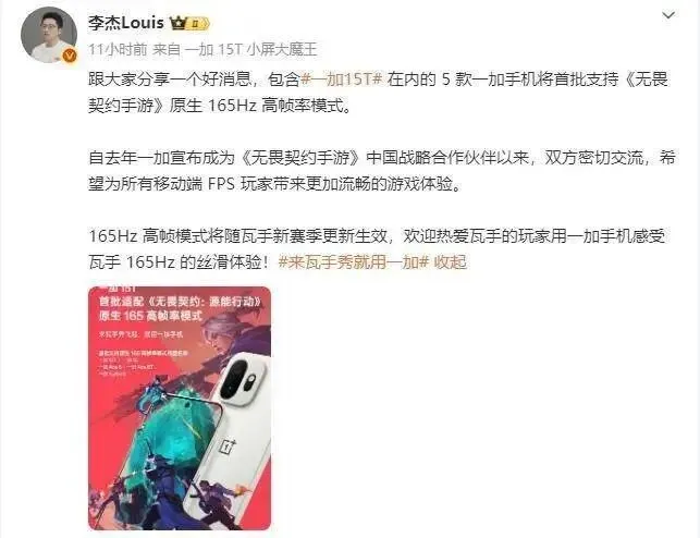 同时, @李杰Louis 还透露,“跟大家分享一个好消息,包含#一加15T# 在内的 5 款一加手机将首批支持《无畏契约手游》原生 165Hz 高帧率模式。