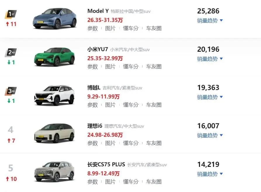 首先我们还是看来排行榜1至5名的车型,整体的销量排名变化还是非常大,并且还有两款车型月销量突破2万辆大关。大家熟悉的特斯拉Model Y表现非常亮眼,销量排名直接跃升至第一名,月销量也是达到2.5万辆。面对众多新势力车型的崛起,特斯拉也展开了一系列的优惠活动,再加上强大的品牌影响力,使得该车型的销量也是回暖不少。小米YU7的销量也是成功突破2万辆大关,位居排行榜第二名。该车上市以来的销量都非常坚挺,就是不知道伴随着自家新款小米SU7的上市,会不会分走一部分销量成绩。