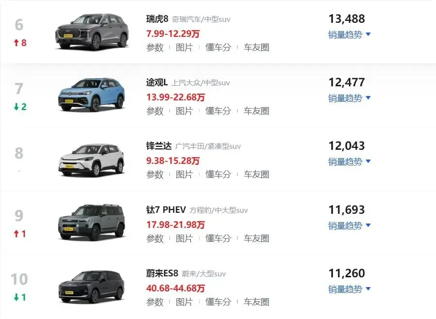 我们再来看看排行榜6至10名的车型,整体的销量排名变化就要小很多,销量差距也不是那么大。奇瑞瑞虎8凭借月销1.3万辆的成绩,销量排名也是大幅度提升,位居排行榜第六名。该车的性价比一直都很高,只是车型版本太杂,如果车型版本再收缩一下,销量成绩说不定还会有不小的增长。大众途观L这款经典合资车型,也是继续稳居排行榜前列,位居第七名的位置。即便大众汽车有越来越多的新款SUV车型上市,但是大众途观的王者位置,依旧是无车可撼动。