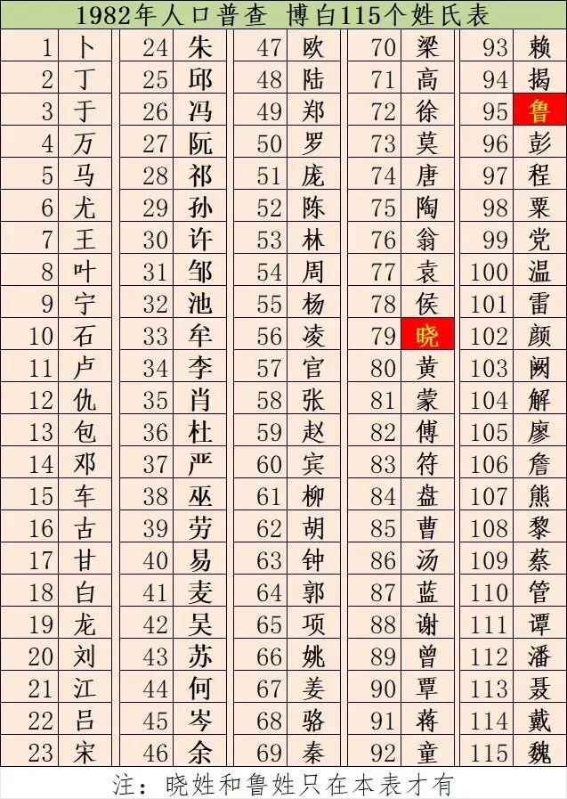 - 在1982年全国第三次人口普查中统计的115姓,晓姓和鲁姓在以上其 他三份榜单中都没有再出现。