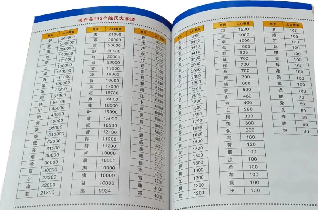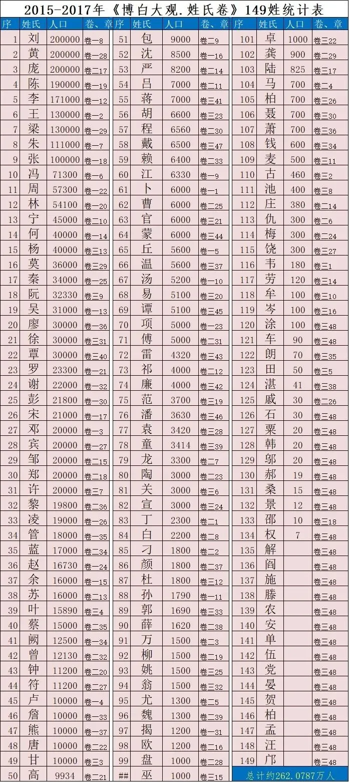 《博白大观・姓氏卷》是由博白县社科联牵头组织编写的祖居博白的姓氏文献,对各姓氏源流、入博宗支、人口分布、氏族名人等核心信息经实地走访调研核对后编写而成,是研究博白本土姓氏文化的比较权威的依据。 该书分三卷编写出版,每卷均以姓氏笔画为顺序,共调研134姓,还有15姓是解放时随军南下等原因定居博白,因后人不在博白探访不便等原因未能全部深入调查,总共149姓。根据该书整理得出的博白149姓排行榜如下: